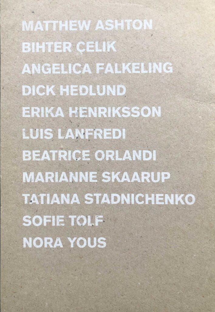 With contributions by Matthew Ashton, Bihter Çelik, Angelica Falkeling, Dick Hedlund, Luis Lanfredi, Beatrice Orlandi, Marianne Skaarup, Nora Yous, Tatiana Stadnichenko, Sofie Tolf, Erika Henriksson .