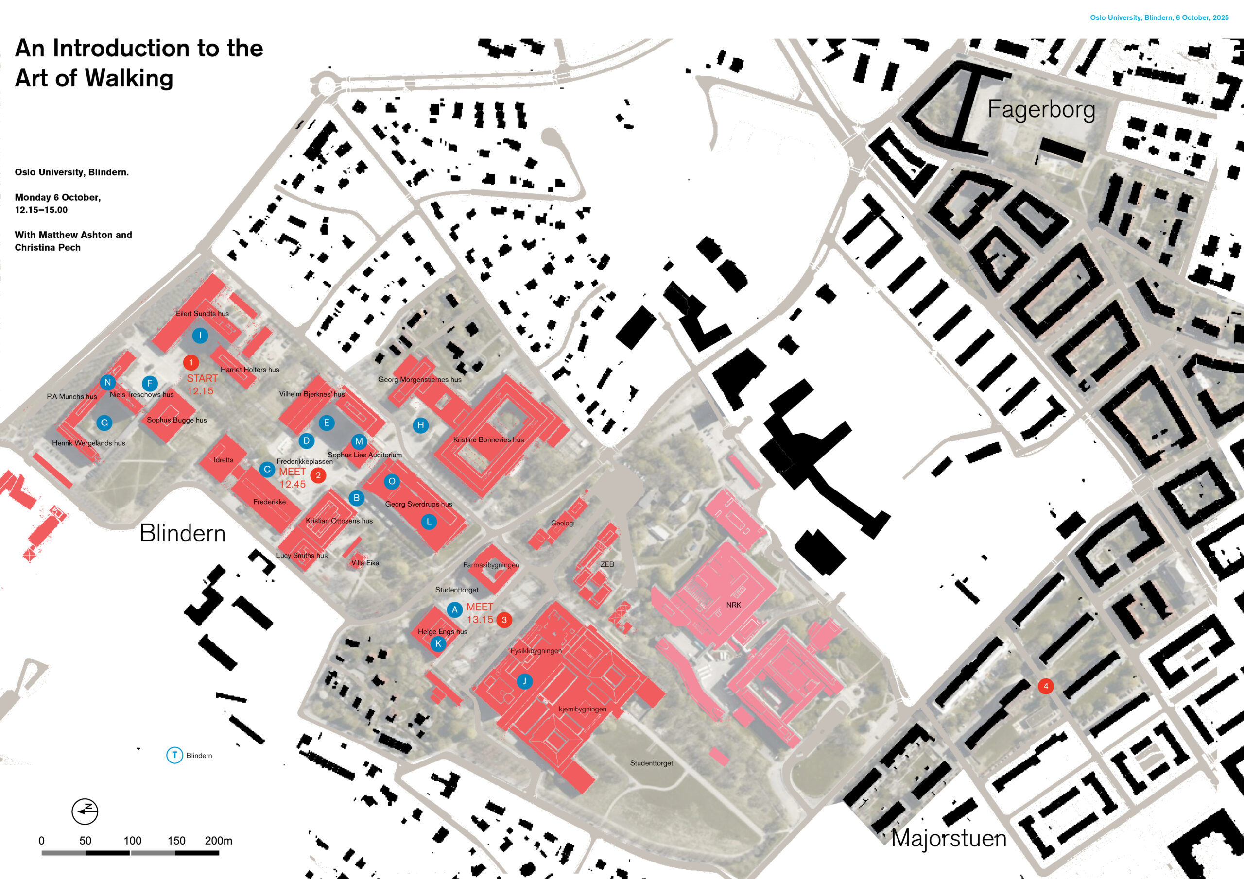 For this final walk we will gather as one large group and walk collectively from the south end of the campus down towards the city, passing through the neighbourhood of Majorstuen, and onwards towards Fagerborg (depending on time). There is no fixed route, but we will decide organically which path we take, following some unconscious pull of the city. We can read the city as a palimpsest of different layers, as various urban ideals, architectural styles, and social-economic realities are juxtaposed atop another. Following on from Stalker and Ford, we should also pay attention to urban borders and boundaries, and the differentiation between public, private, and ambiguous spaces. Do we need to follow the designated paths, or can we transgress them?