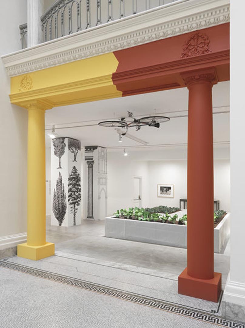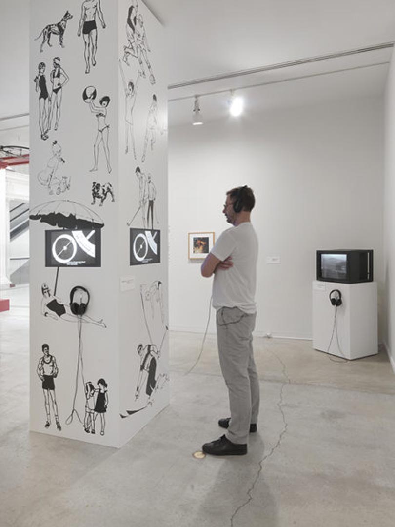 The majority of the pieces on display were intended to simulate the original artefacts. Films and slide shows were presented through digital video reproductions. The bicycle was loaned from a bicycle collector in Vancouver. While most photographs were made from digital files into prints, a small number of original items were put on display, including the S-Space white fur cover catalog, several magazines from the period, and original BW photographs from the 9999 archive, along with an accordion fold-out collage made between 1971 and 1974 depicting Interplanetary Architecture, from the Alessandro Poli archive.