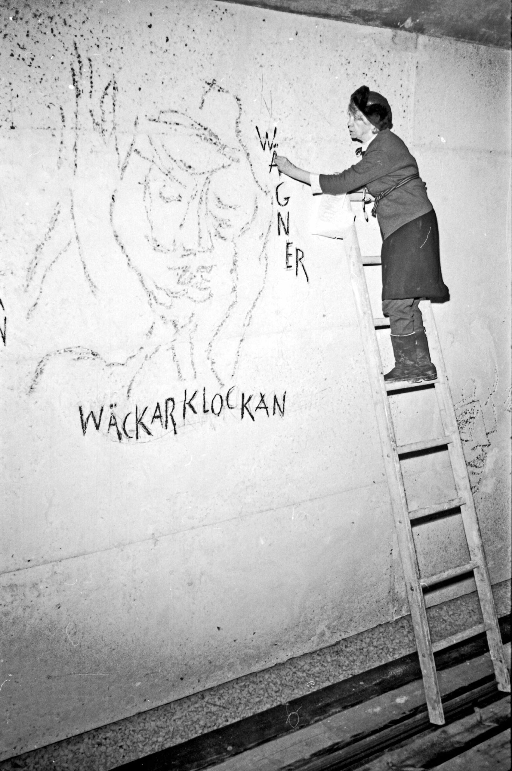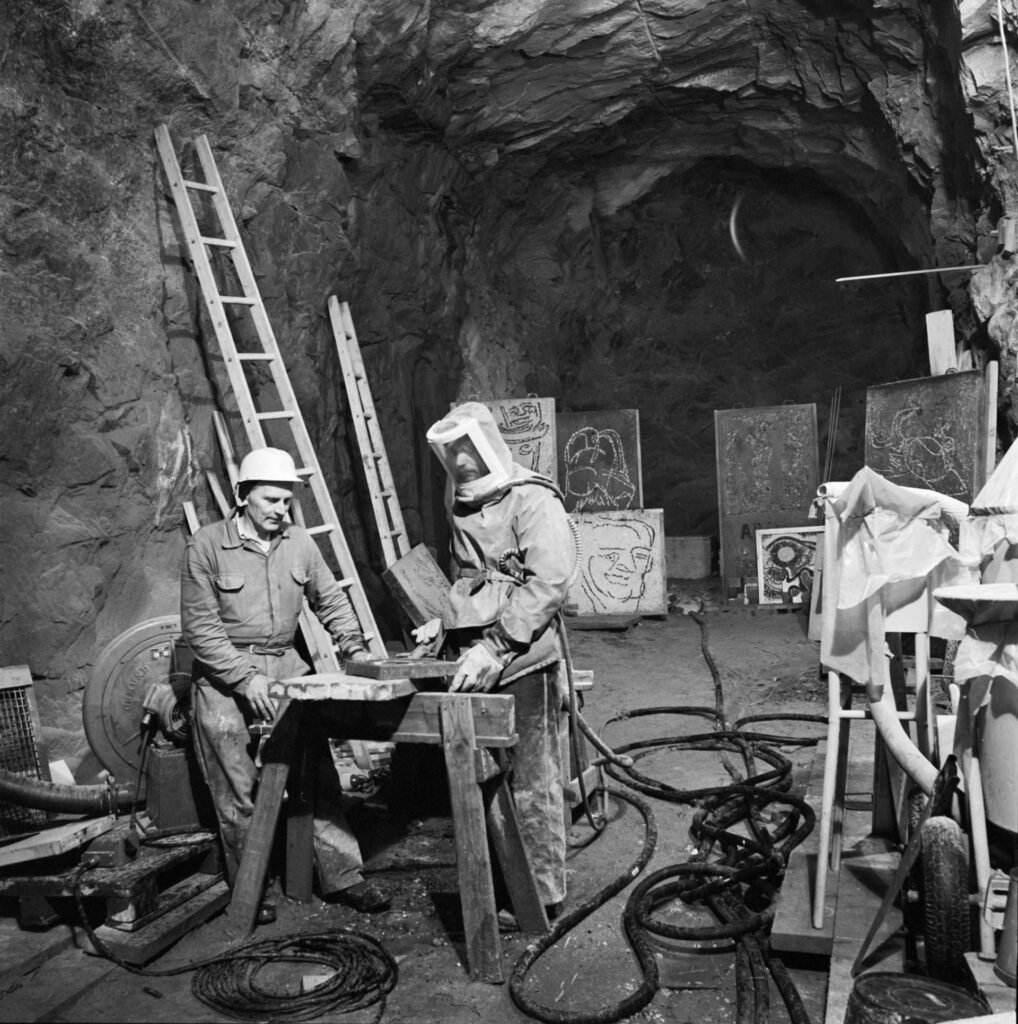 In October 1962, Nesjar visited Stockholm to meet the Swedish artist Siri Derkert, who had recently won the public art commission for the new subway station of Östermalmstorg. Derkert planned to decorate the station with two 145-meter-long panels of naturbetong stretching the length of the platform, sandblasted with her expressionist motifs.[32] The artwork took inspiration from the women’s rights, peace, and environmental movements, with figures including Rachel Carlson, Simon de Beauvoir, Albert Einstein, and Jean Paul Sartre etched into the concrete surface. Nesjar was to assist the then 77-year-old Derkert with the technical aspects of the project and provide consultation on the sandblasting process [Image 10-11]. It was here while in Stockholm that Nesjar met with Pontus Hultén at the Moderna Museet, and the initial idea to host an exhibition on art in concrete began to develop.[33] Nesjar had a close friendship, and productive working relationship with Pablo Picasso, with the two artists collaborating on a series of large-scale concrete sculptures. Picasso would provide sketches or small models, which Nesjar then transcribed into full size concrete forms.[34] This collaboration led him to work on projects all over Europe, including several private commissions in France, as well as a wall frieze for the College of Architects in Barcelona. Pontus Hultén, as director of the Museum of Modern Art, was tasked with building up the young institution’s permanent collection and regarded a Picasso/Nejsar sculpture as a self-evident addition to the sculpture garden. In 1963, Hultén approached Nesjar with a more formal proposal, inviting him to construct a Picasso sculpture for the forthcoming exhibition Konst i betong—with the explicit aim of later purchasing the sculpture for the museum’s permanent collection. The sculpture, originally titled Figure Découpée, but renamed Fågelfisken (The Bird Fish) for the exhibition, was based on a design previously executed by Picasso and Nesjar for the Mur Vivant exhibition at the Grand Palais in Paris in 1963—an exhibition visited by Hultén, which also showcased possibilities for collaboration between art and architecture. Following Konst i betong,however, the board of the museum did not grant permission to acquire Fågelfisken for their permanent collection and the sculpture was sold to the City of Helsingborg in southern Sweden, where it was installed on a wall in the new municipal housing estate of Norlunda.[35]