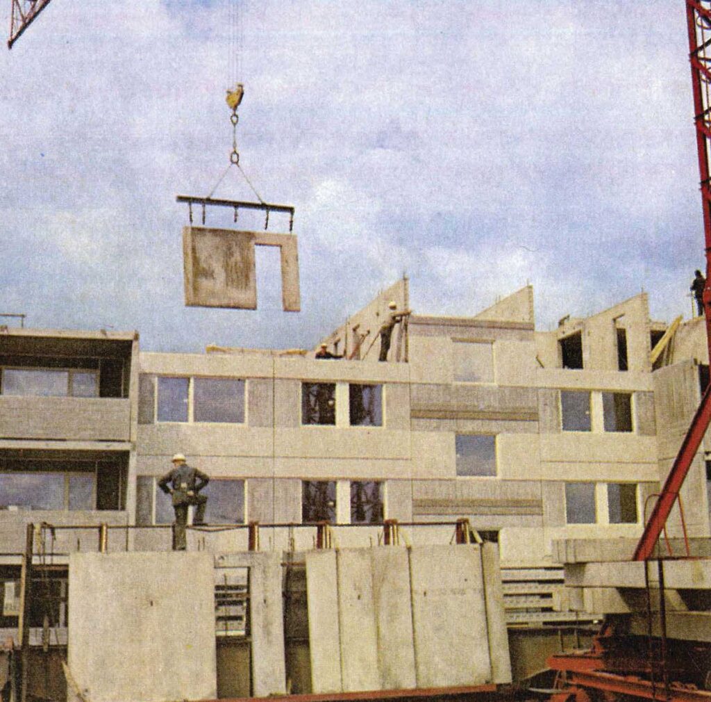 One of the main factors driving an increased interest in prefabricated concrete construction methods in the early 1960s were acute labor shortages, and the sky-rocketing building costs that followed. Real economic growth was achieved through the export-orientated manufacturing industry, not the local construction industry, so with a limited supply of workers it was preferable to automate building processes as much as possible to increase the supply of labor available to manufacturers. Once the prefabrication technology had been implemented in residential construction, the following step was to develop integrated building systems where the elements were part of an interconnected chain from design and project planning to factory production and implementation.[13] Rationalized construction methods dramatically improved productivity—in 1950, it took approximately eight hours of work to complete a cubic metre of housing with traditional craft-based construction, while by the start of the 1970s the same amount of work could be completed in two and a half hours.