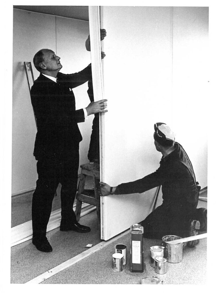 The exhibition opening was a gathering that would bring together artists, curators, engineers, architects, planners, builders, landlords, material suppliers, and politicians, staging a broad discussion about concrete as a material, and its place within the future of the Swedish welfare state. In attendance was a powerful yet diverse group of actors with substantial cultural, political, and economic muscle, who could exert substantial influence over governmental policy directions. The opening party was followed by a four-day conference, with Allan Skarne, owner and director of Ohlsson & Skarne, invited as a distinguished keynote speaker.[5] Skarne (1909-1998) was a second-generation builder deeply involved in the shift from a craft-based to an industrialized construction sector in Sweden and abroad; starting in 1963, licensees of the Skarne System were located in six European countries, as well as the Middle East.[6] [image 2] He also shared a close personal relationship with the museum’s director Pontus Hultén, who was married to his niece, Anna-Lena Wibom. Skarne was a keen collector of modern art, amassing an enviable collection at his private island residence in Stockholm, and upon the occasional request from Hultén, provided financial support to the budding museum, including the purchase of the large-scale Alexander Calder sculpture The Four Elements in 1961, which he gifted to the Museum’s permanent collection in 1967.