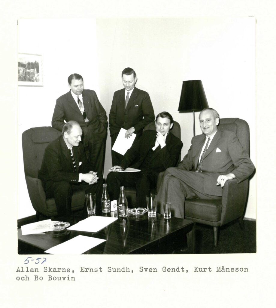 In 1955 Allan Skarne was influential in establishing a network of like-minded individuals interested in developing, improving, and sharing knowledge about prefabricated concrete panel construction. The group, known as “D4 Gruppen” (the D4 Group), consisted of builders Allan Skarne, Ernst Sundh, Sven Gendt, and Bo Bouvin, with Kurt Månsson serving as secretary. [image 4] All had senior roles in companies and organizations pursuing technical innovation and rationalization within the construction industry. Over the course of forty documented meetings, everything from safety at work during prefabrication to pricing for assembly work was discussed, and in 1960 they even founded the company Sprutteknik AB together to circumvent the painting trade union and built 42 houses in Jakobsberg.[16] D4 Gruppen formed a hub for element-based construction, primarily through collection and dissemination of know-how, as well as the development of new financial and technological models. The members were in touch with all parallel developments in industrial construction in Sweden—architects, government initiatives and investigations, as well as with other element builders. The group and its members thus played a critical role in innovating, expanding, and disseminating knowledge about prefabricated concrete panel construction methods in the period directly preceding the Million Homes Program, and set the conditions for the unprecedented large-scale housing construction necessary for its implementation.
