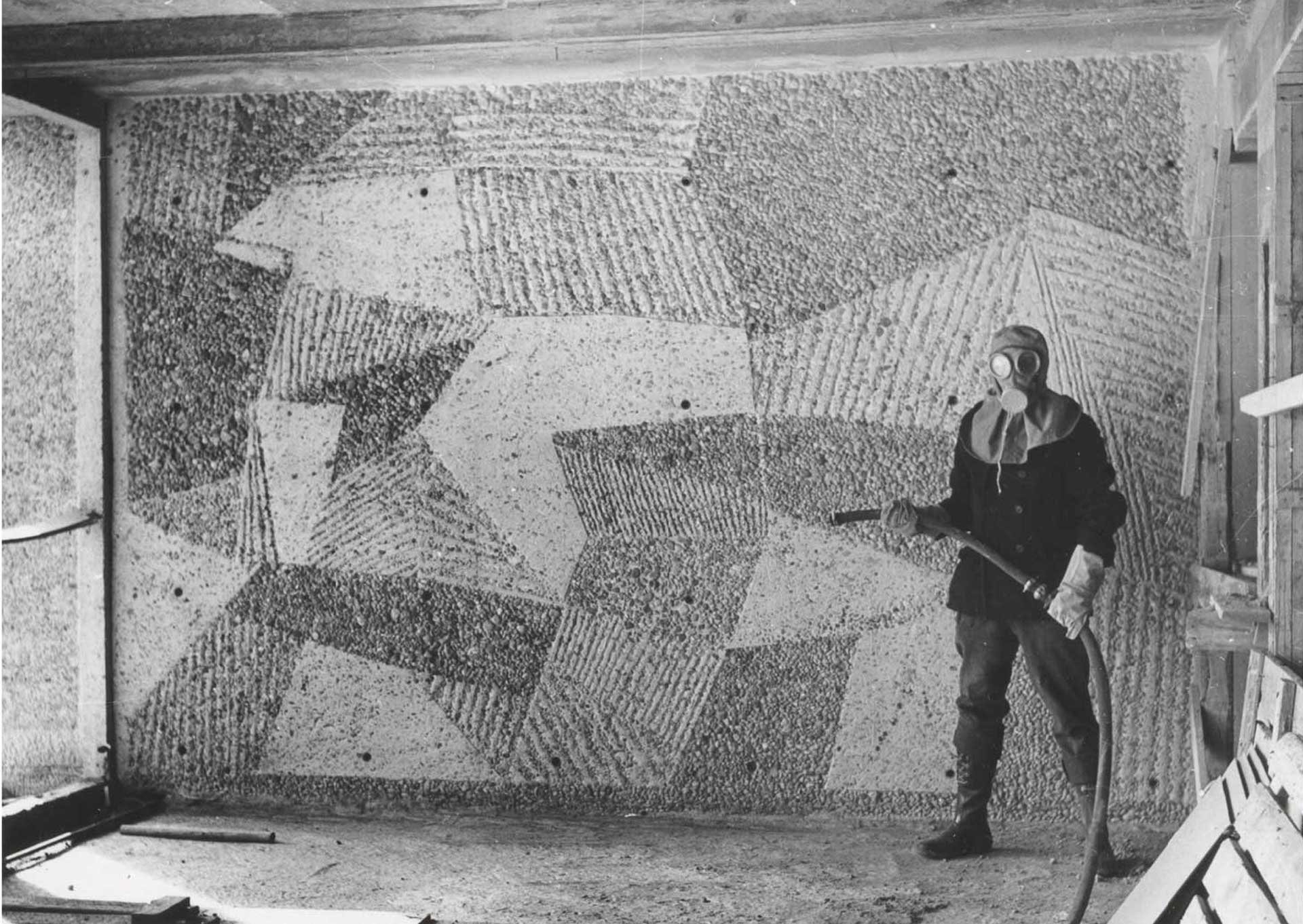 Carl Nesjar was undoubtedly a central figure behind the exhibition, as one of the leading Nordic artists working with concrete at the time. He had become one of the preeminent experts in the technique of sandblasting concrete—a method of engraving a concrete surface by exposing it to a flow of sand pumped under immense pressure, which he likened to painting with a firehose.[28] He perfected this technique through years of close collaboration with the Norwegian architect Erling Viksjø on the government quarter in Oslo, which was constructed entirely of naturbetong (natural concrete) [Image 9]. Naturbetong is a particular concrete process and technique developed through experimentation by Viksjø, and later perfected, and patented, with the help of the civil engineer Sverre Jystad.[29] The process involved first tightly packing a formwork with clean, washed aggregates of a similar grade, before injecting a fine liquid cement mixture, which filled in the voids between the stones. Before the concrete hardened completely, the formwork was removed and the surface sandblasted, revealing an even layer of tightly packed stones. [30] Naturbetong accentuated the intrinsic aesthetic qualities of the material itself, transforming the composite character of concrete into a creative palette that offered endless opportunities for artists and architects. As Erling Viksjø reflected, “concrete is in the process of finding its own architectural and constructive language, and we can no longer accept cladding with stone or clay. The concrete—the building material itself—must have its own expression of architectural value.”[31] Naturbetong transformed concrete into a luxurious material, worthy of adorning important public buildings traditionally clad in stone or masonry, and as with prefabricated concrete panel construction, the façade and the structure are one and the same. While the technique employed in the construction of naturbetong differed significantly to that developed by Ohlsson & Skarne in their building systems, they both supported each other in elevating the status of the material, both technically and aesthetically. The use of unadorned concrete in these high-profile architectural projects would no doubt lend some legitimacy to its usage in more everyday situations— schools, offices, and apartment blocks.